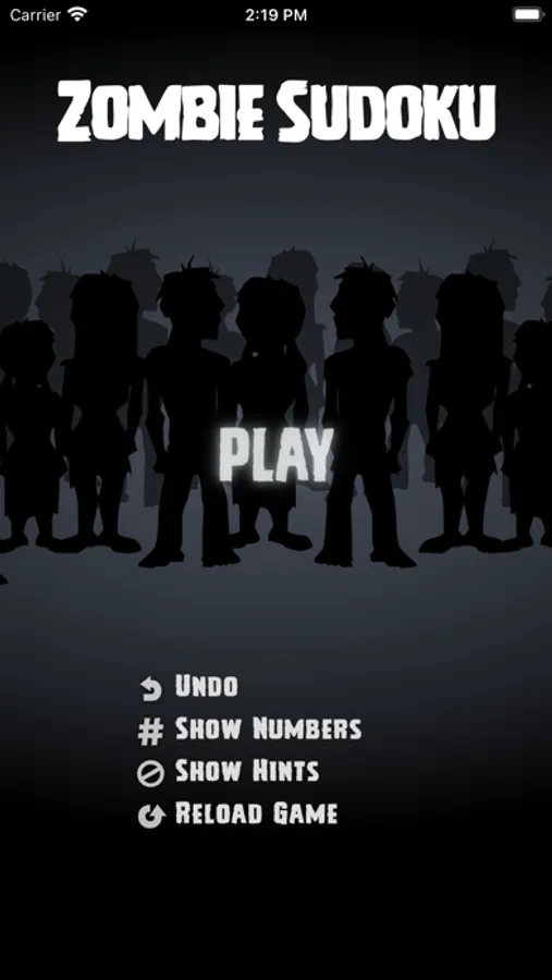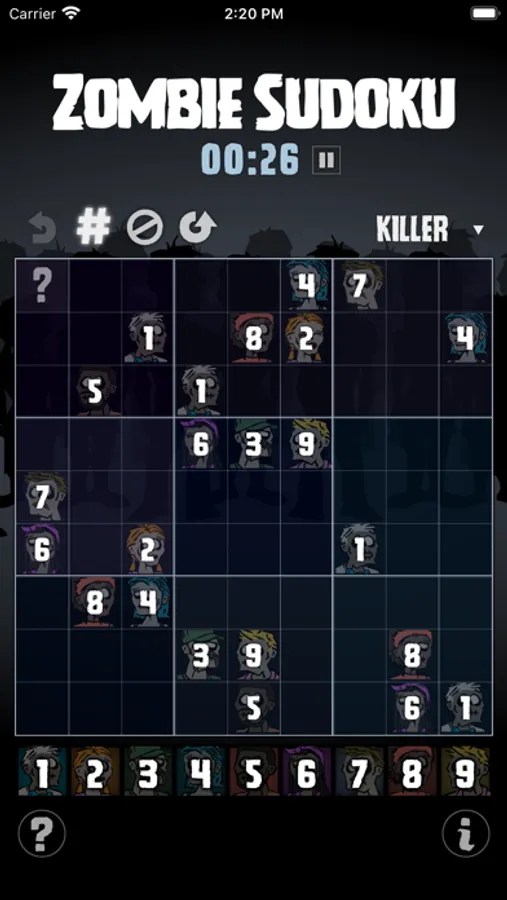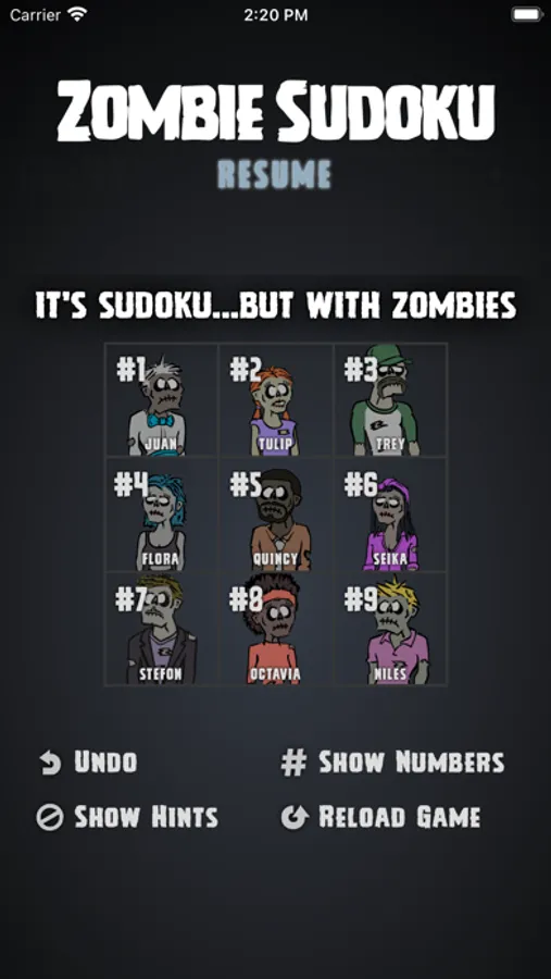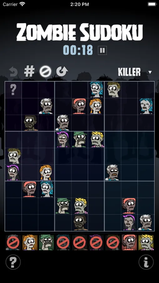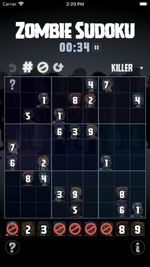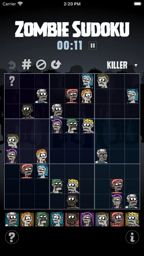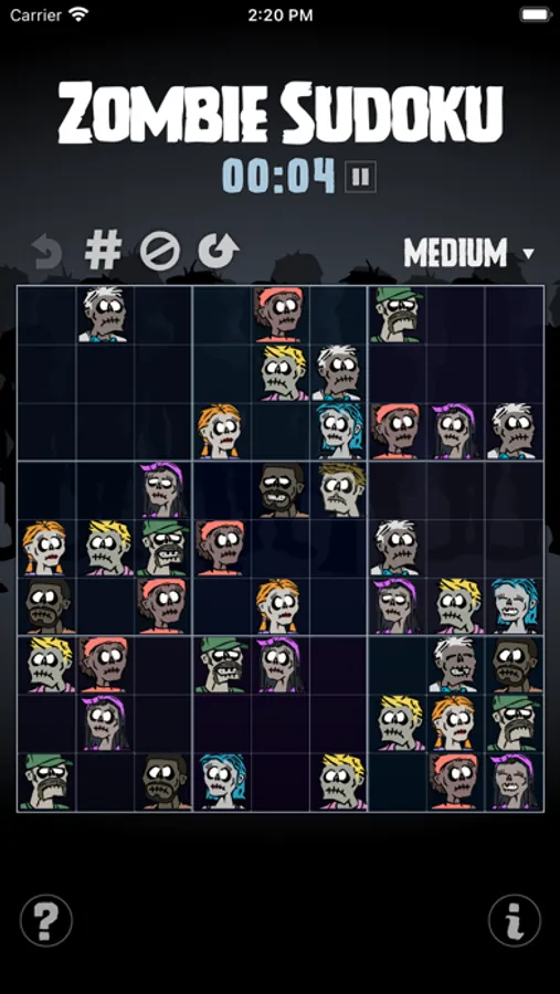 There are nine zombies: one for each number in a typical 9x9 Sudoku game. The challenge is to step away from numerical logic and exercise visual thinking. There are four levels of difficultly, hints are available, and numbers can be activated. But the only score is time, and the only competition is you.