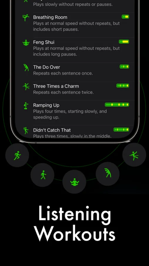 • Follow a listening workout, with sentence repeats, pauses, and slow downs