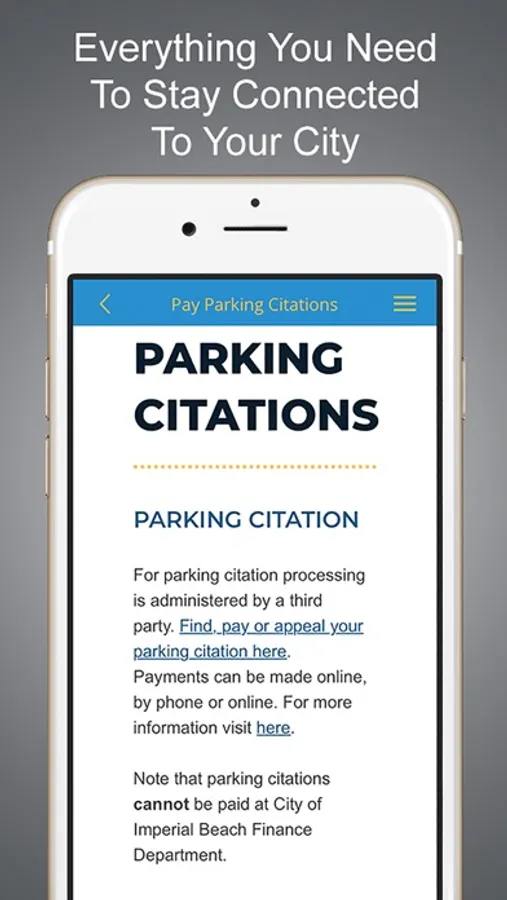 Become a civic resident and engage with your city like never before by downloading the official app. With features like Current News, Parks and Facilities, Pay Parking Citations, and Office of Mayor and City Council you'll find it easier than ever to stay connected with City of Imperial Beach, CA with just a few taps on your mobile device.