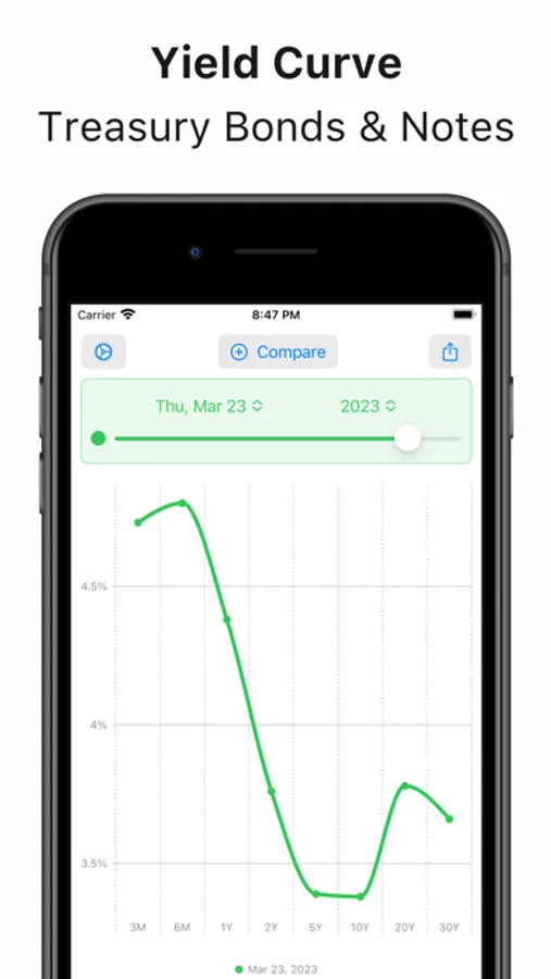 The Treasury Yield Curve Tracker is a simple app that allows users to view and analyze the current shape of the US treasury yield curve. The app offers a range of customizable features including the ability to quickly adjust the time period and compare historical yield curve shapes side by side.