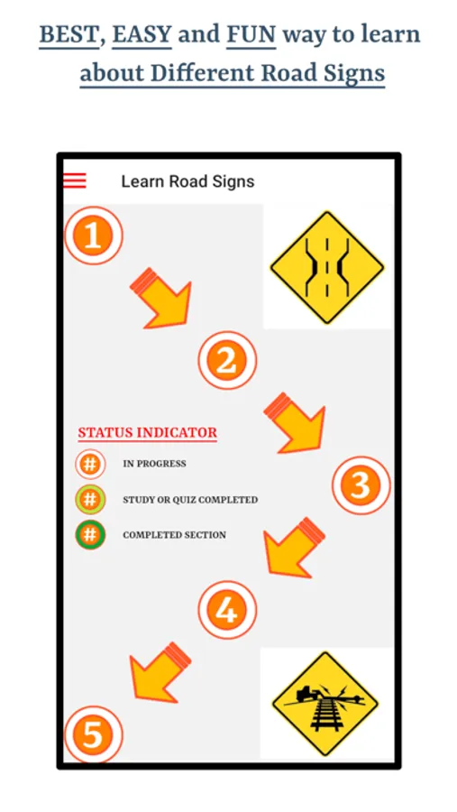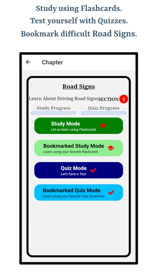 This app is a great resource to memorize Most Commonly Used Road Signs . The app is engineered to make users perfect identifying different road signs by studying for a very short amount of time. Audio functionality and bookmarking is available throughout the app on chapter, section, study mode and quiz modes.
