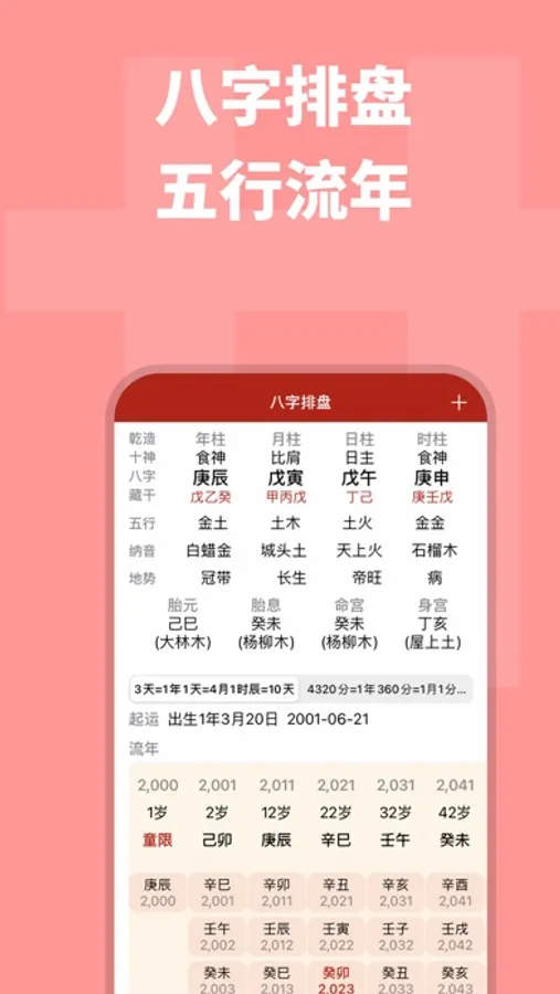 2.命盘:八字排盘,根据生日推算出生辰八字,不同流派智能排盘,转运流年一目了然。