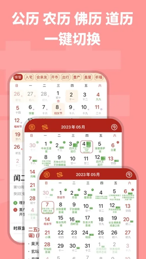 提供公历、农历、吉日日历、生理日历、万年历、节气、黄道吉日、日期换算、生日提醒等功能;