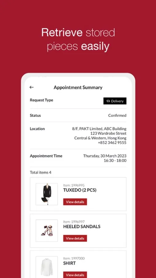 - Access pieces easily with on-demand deliveries that arrive ready-to-wear. No more rummaging.