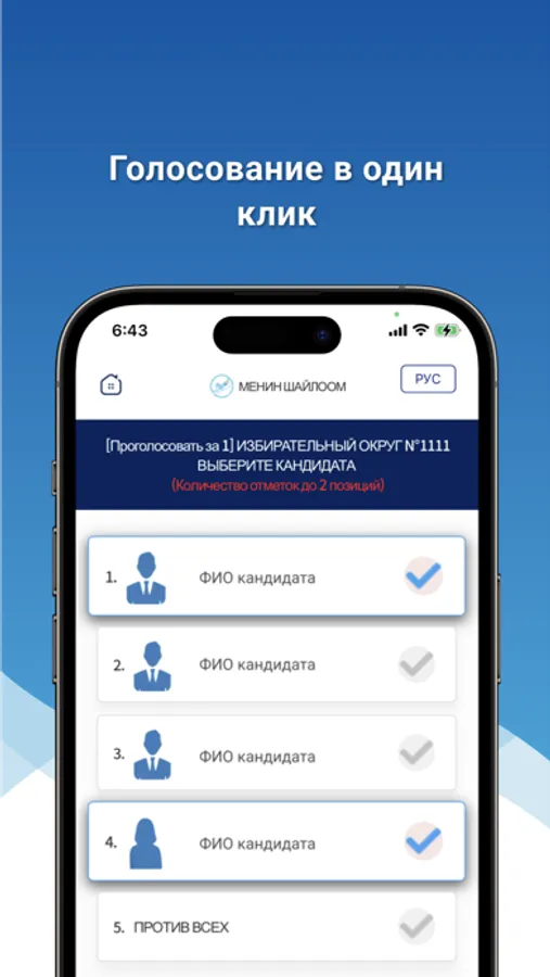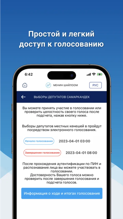 Приложение предлагает удобный интерфейс и интуитивно понятное управление для удобства избирателя. Избиратели могут пройти биометрическую идентификацию и проголосовать в приложении, также получить доступ к информации о ходе голосования в виде графика и сведениям кандидатов.