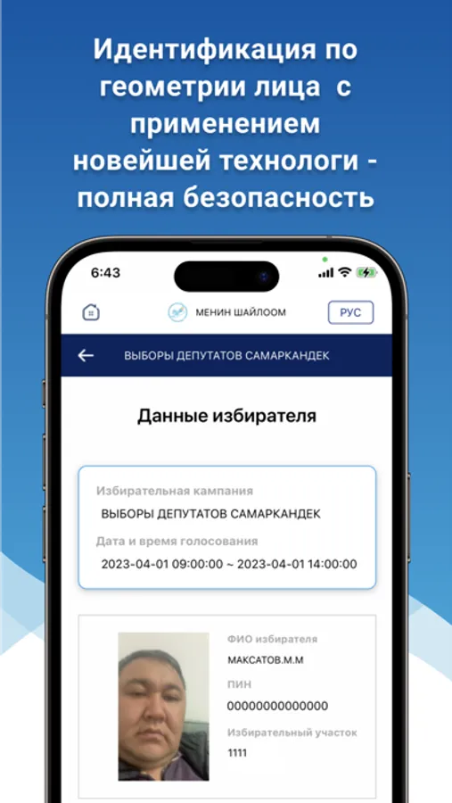 Приложение обеспечивает участие избирателя с прохождением биометрической идентификации по технологии распознавания лиц в онлайн режиме. Лицо избирателя распознается и сопоставляется с предварительно зарегистрированной информацией в списке избирателей, гарантируя, что только идентифицированные избиратели могут проголосовать.