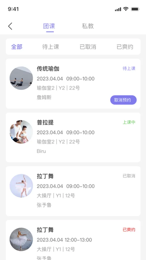线上团课预约,私教课预约,场地预约、会员卡请假等。