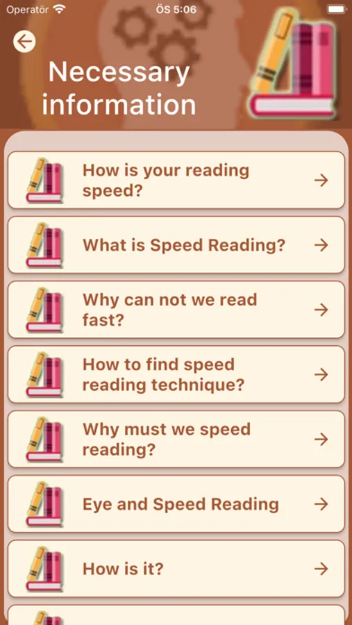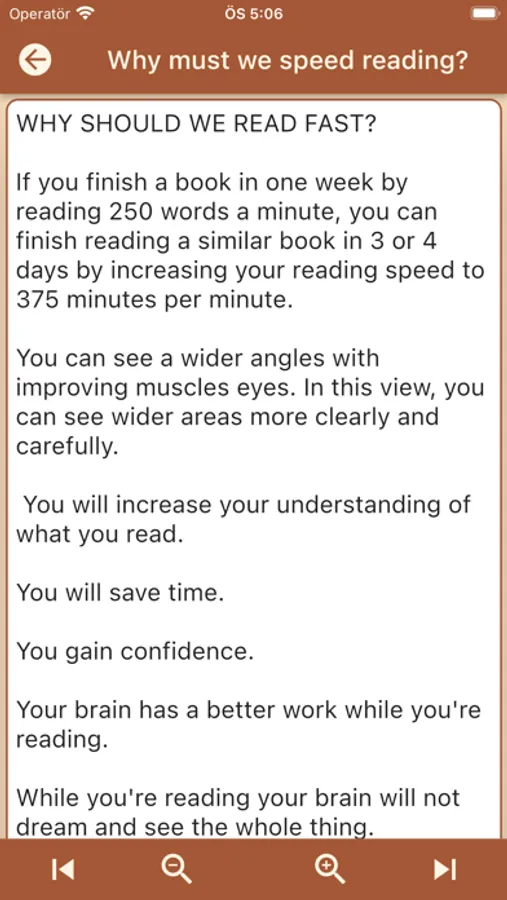 Speed reading is an ability that can be improved. You can read very quickly BY improving your eye muscles. You can improve your eye muscles with exercises in our application. There are 20 exercises in it.