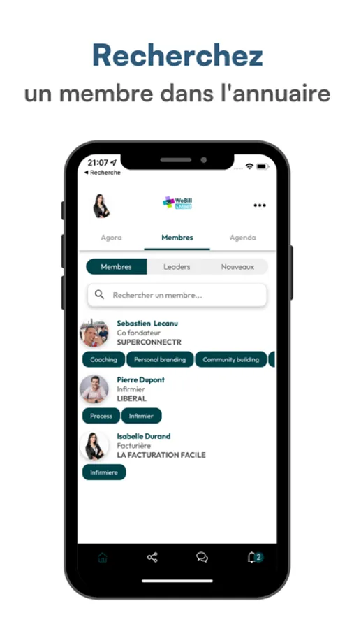 Recherchez facilement un membre du réseau par nom, prénom, entreprise, compétence, localisation... L'essentiel pour faciliter votre networking !