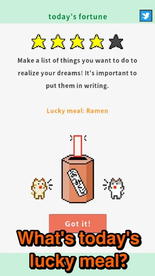 Check your daily fortune and lucky meal. Enjoy your food as a reward for not drinking!