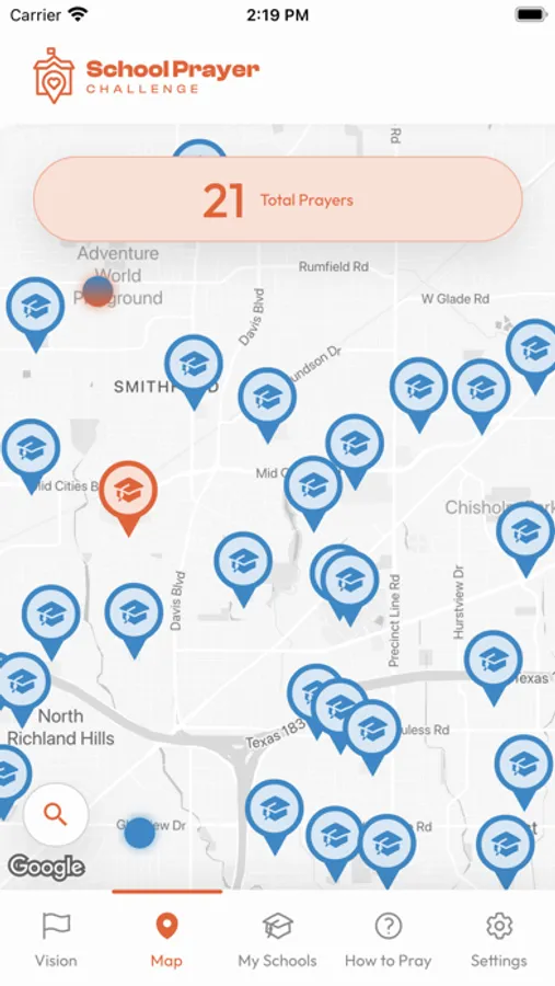 Use our map to locate schools in your area to pray for regularly. Schools with a blue icon have not been selected and will appear orange once selected.