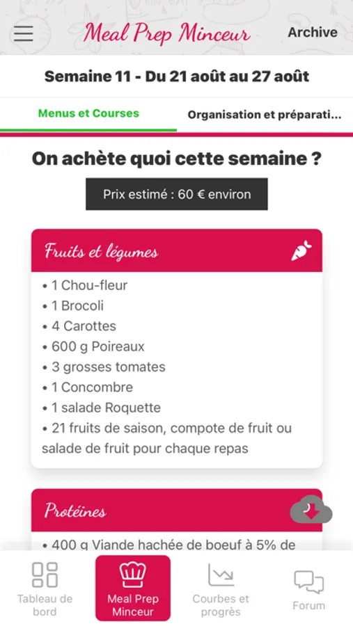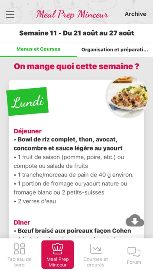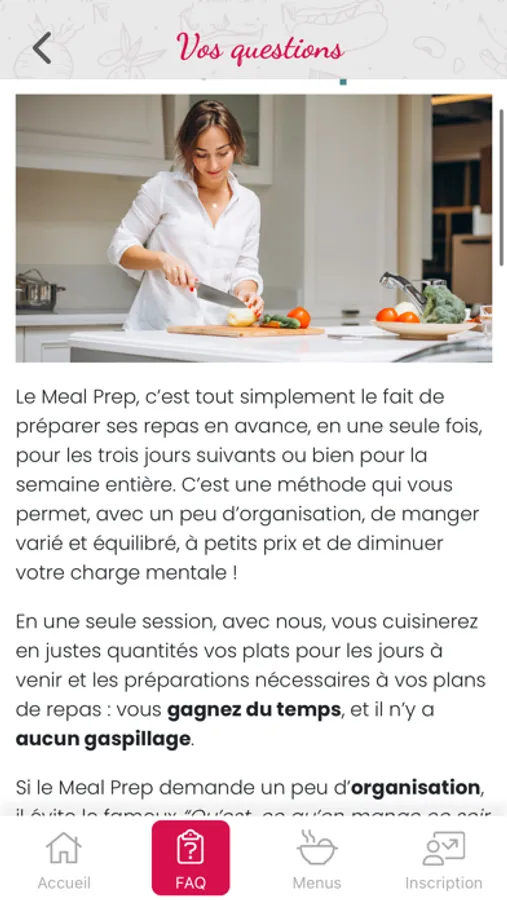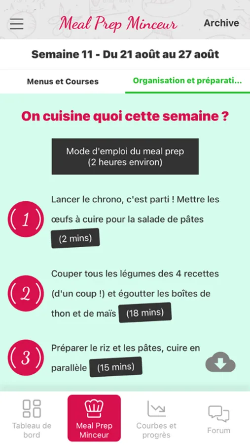 Cette application gratuite contient un essai du Meal Prep Minceur 100% gratuit qui inclut 1 semaine de menus et la marche à suivre complète pour votre séance de cuisine.