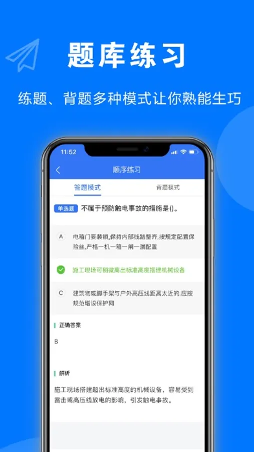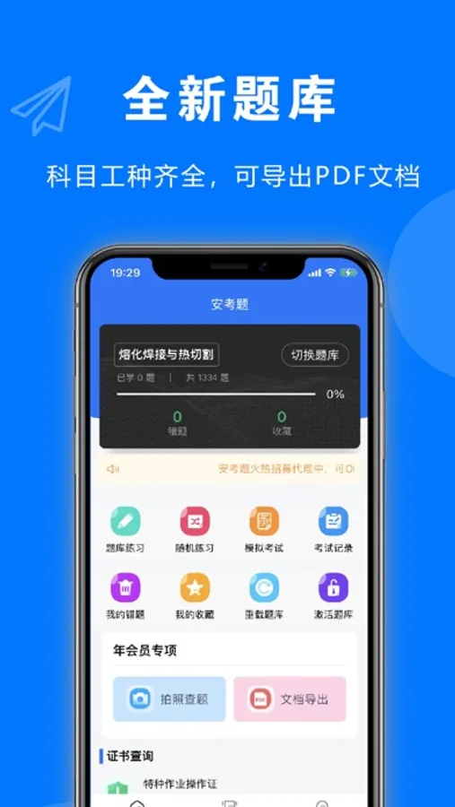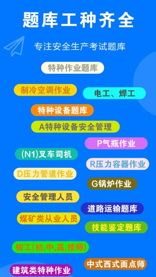 安考题安全生产模拟考试平台主要提供特种作业电工、焊工、高处作业、空调制冷、特种设备、职业技能鉴定、煤矿类从业人员、建筑类从业人员考试题库,涉及300+工种项目,题库总量共计300万余道 。题库主要为学员提供练考服务,主要功能有题库练习、随机练习、错题收藏、模拟考试、练题分析等功能。帮助考生快速备考,轻松通关。