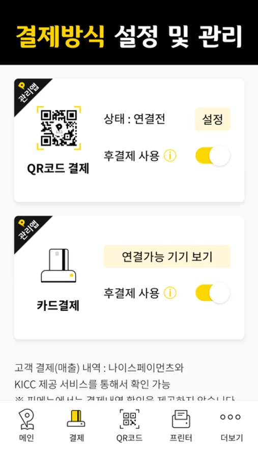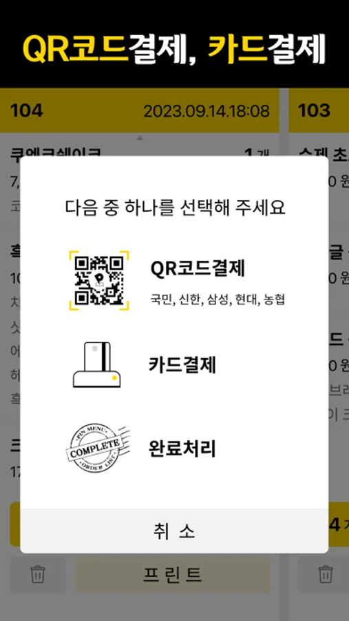 - 주문내역 카드결제 : 핀메뉴 지정 카드단말기로 결제 가능
