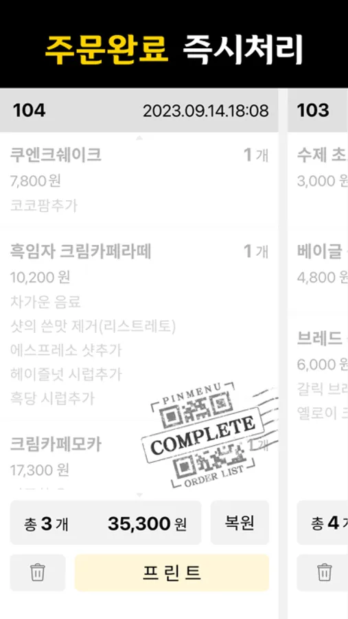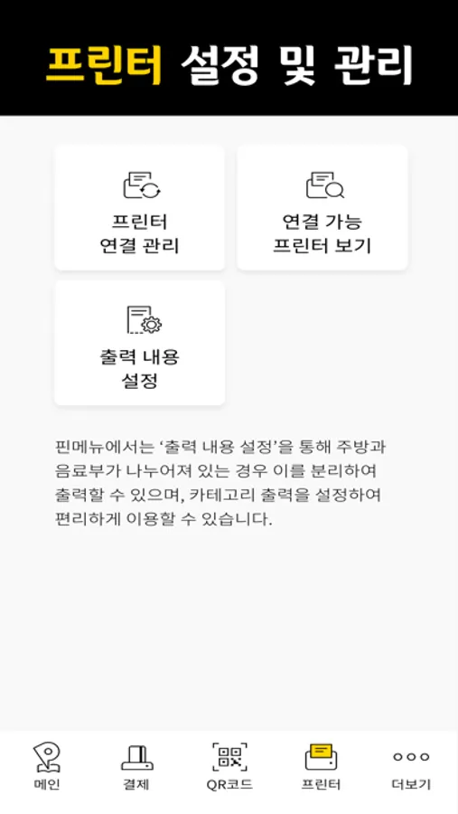 - 주문내역 인쇄 : 핀메뉴 지정 프린터로 주문내역 출력 가능