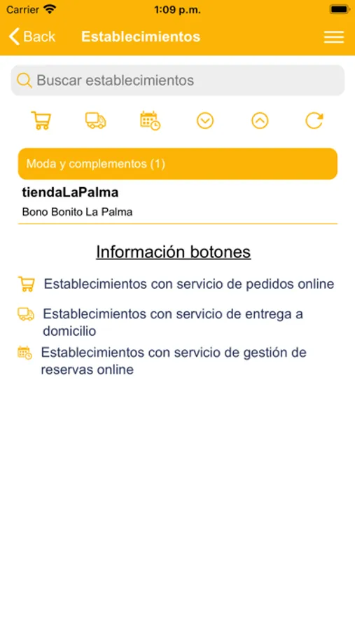 The Application can be used without having to be registered. In this case, users will have access to the list of establishments in the municipality of la Palma that have joined the campaign, of which relevant information is provided so that users can easily find what they are looking for and make any purchases in-person.