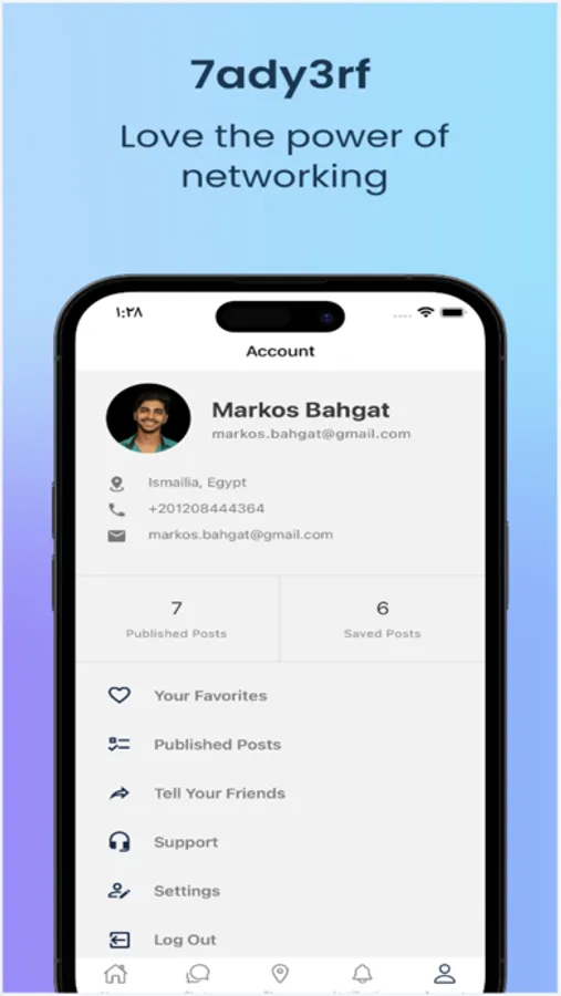 7ady3rf is a social networking platform that allows users to create a profile, connect with friends, share posts, photos, and videos, and interact with other users through comments, likes, and messages. The app typically offers a newsfeed that displays content from other users, as well as features such as real-time notifications, events, and a places zone where users can review new places and post their own places.