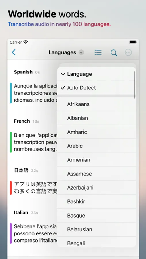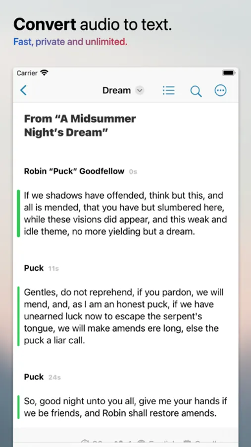 Transcriptionist quickly and privately converts speech from audio recordings into text. Writing up notes for a meeting? Creating transcripts or subtitles for a podcast? Looking for just the right clip to cut out of a long recording? Or quotes for a news article? Need to remember what happened on game night? Or just want to remind yourself of what was said, without listening to the entire recording? Transcriptionist can help — in nearly 100 languages.