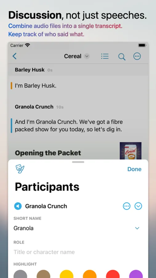 If each speaker was recorded with their own microphone, Transcriptionist will track who said what, when — and you can solo individual voices to pick out what someone said, even if another person talked over them.