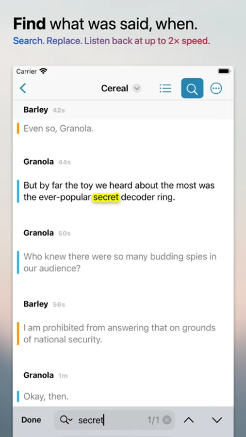 Import the audio into the app, tap the transcribe button, and it will start to fill in the text that was spoken. Each piece is shown with a timestamp, and you can jump straight to the matching point in the recording to listen back to the original audio — at up to 2x speed.