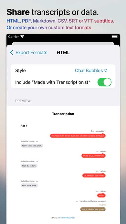 Copy and paste quotes into an article you're writing, or export the entire transcript in a range of formats, including PDF, HTML (web page), Markdown (blog post), SRT and VTT (subtitles), as well as formats suitable for importing into other apps — you can even create your own custom text-based formats with the built-in easy-to-use visual editor.