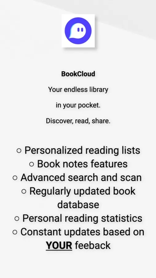 Embark on a literary journey like never before with BookCloud, the one-of-a-kind mobile book application that helps you discover new authors and books while keeping track of your reading progress. Connect with friends, share your favorite reads, and get inspired by fellow book lovers. Join us now and experience a whole new way to enjoy reading!