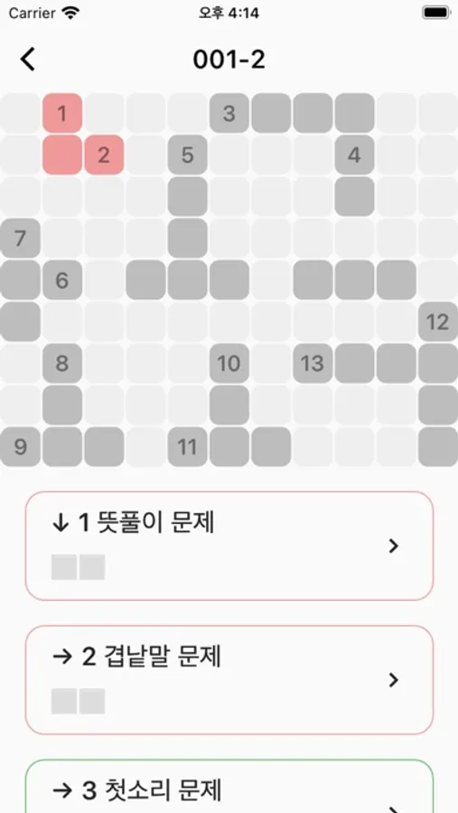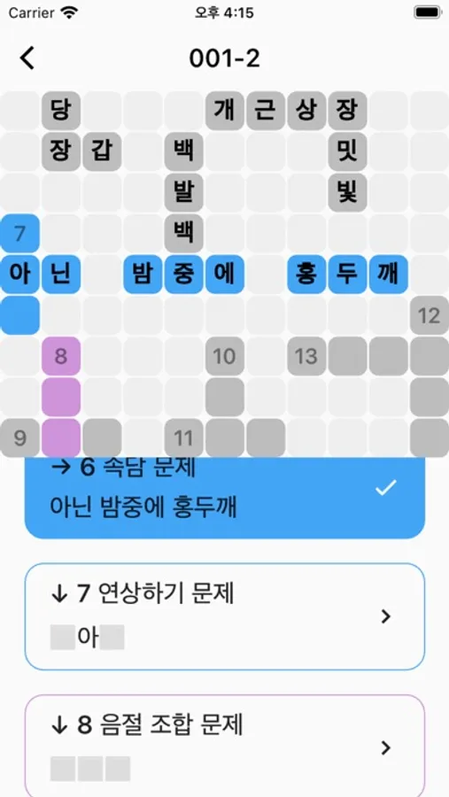 하나의 십자말풀이는 15개 정도의 문제들로 구성되어 있고 모든 문제를 해결하면 십자말이 완성이 됩니다.