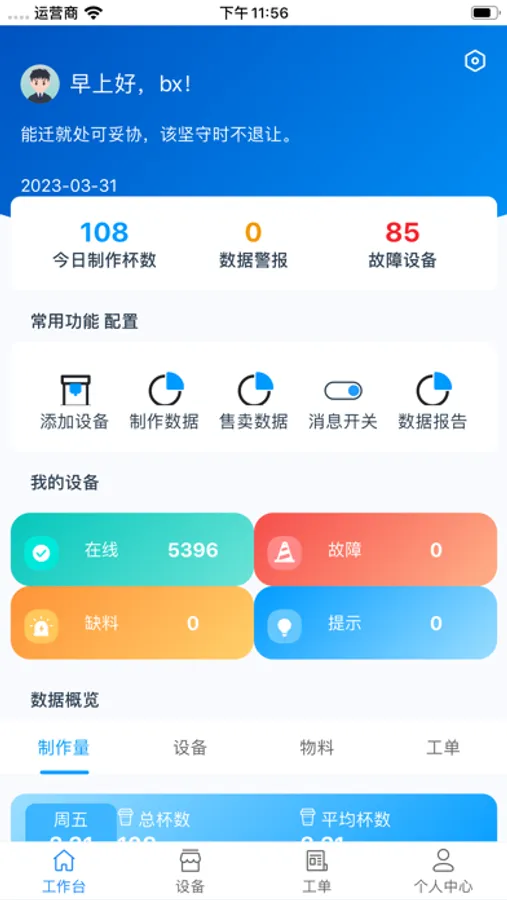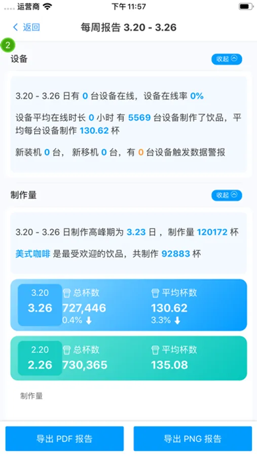统计设备的饮品制作、饮品售卖、运维数据等多项记录,支持多种图表分析运营数据。更有日周月报表推送,让数据分析不再麻烦。