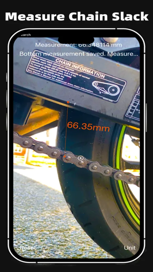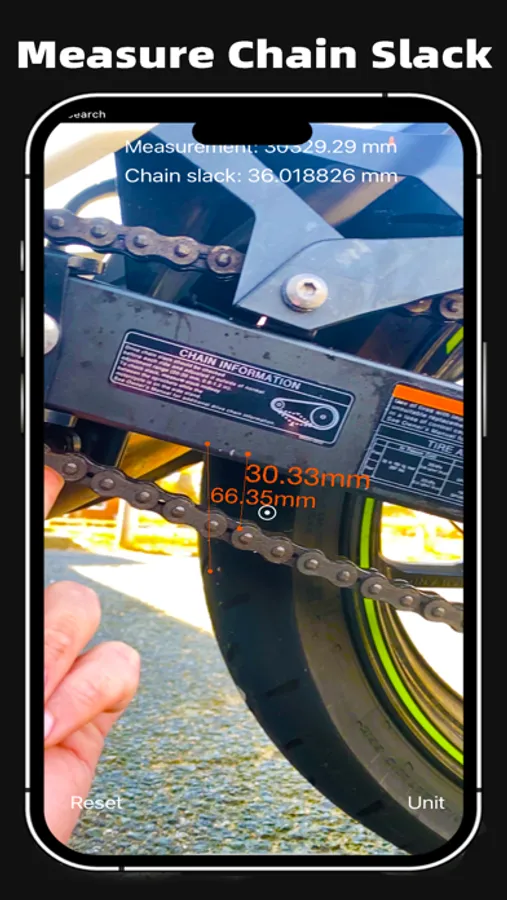 Using Moto Vision is simple - just point your phone's camera at your motorcycle's chain, and the app will automatically detect the chain slack and provide accurate readings in real-time. Our advanced augmented reality technology ensures precision measurements every time, giving you the confidence to make the necessary adjustments and keep your bike running smoothly.