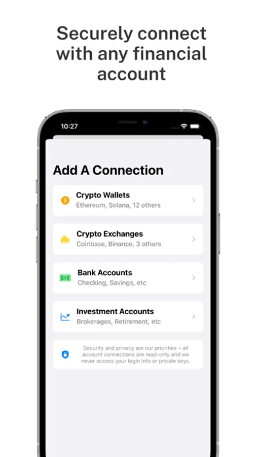 Link and sync multiple financial accounts across various platforms – from banks to brokerages, retirement plans to crypto exchanges and wallets. View your entire financial profile from one comprehensive and user-friendly interface.