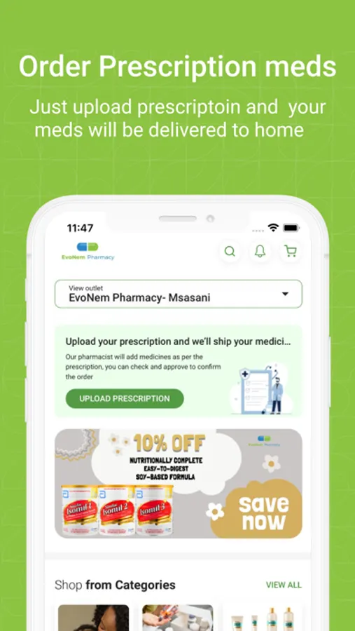 Getting prescription drugs and OTC medicines at your doorstep is now simple and easy. With EvoNem Pharmacy App conveniently order your medicines from anywhere in Tanzania. Choose products from our wide range of product catalog or simply upload your prescription, and your order will be delivered to your doorstep. Use the EvoNem Pharmacy app to order medicines, track your orders, set pill reminders, save health records and more.