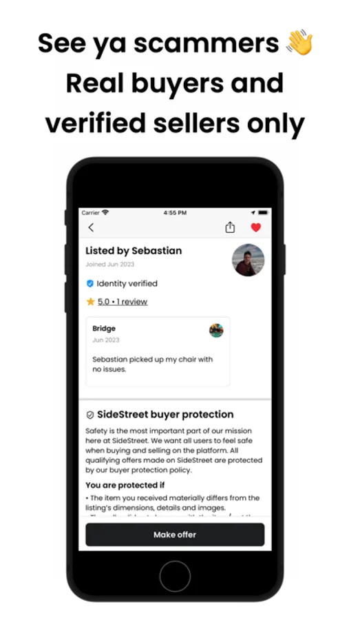 Shop confidently knowing that all sellers are real people. If you don’t get what you paid for, get your money back with SideStreet’s buyer protection policy.