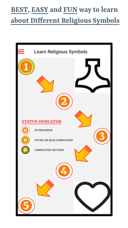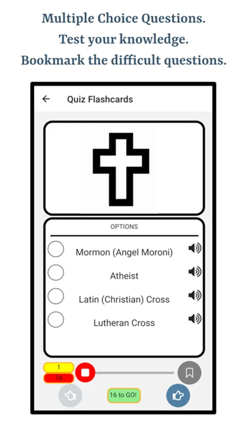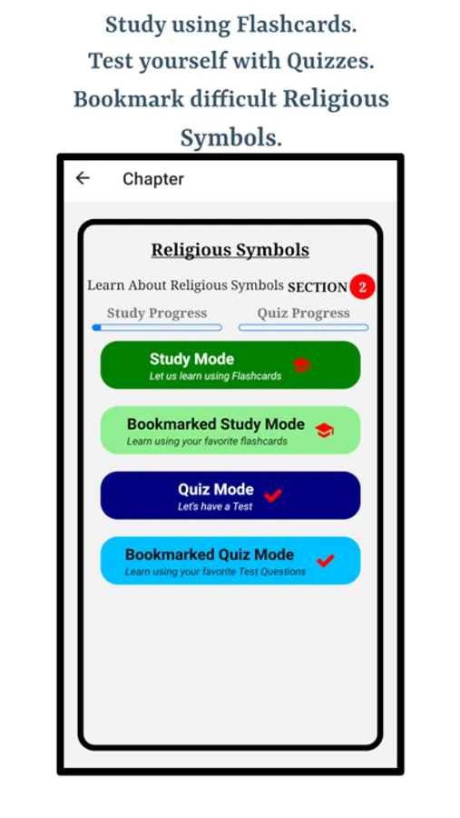This app is a great resource to memorize Most Commonly Used Religious Symbols . The app is engineered to make users perfect identifying different religious symbols by studying for a very short amount of time. Audio functionality and bookmarking is available throughout the app on chapter, section, study mode and quiz modes.