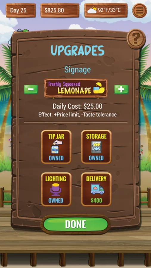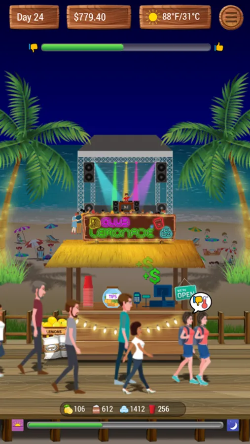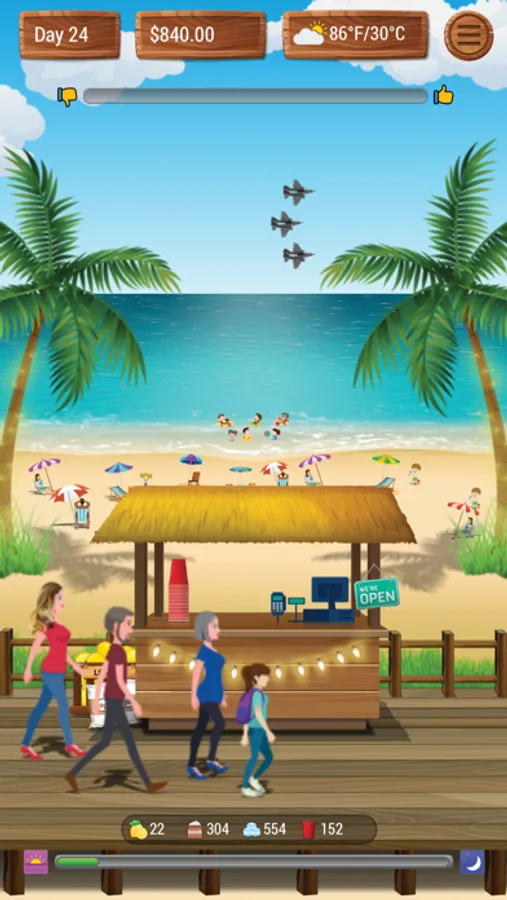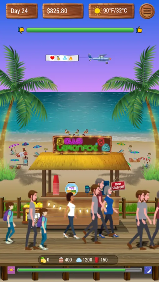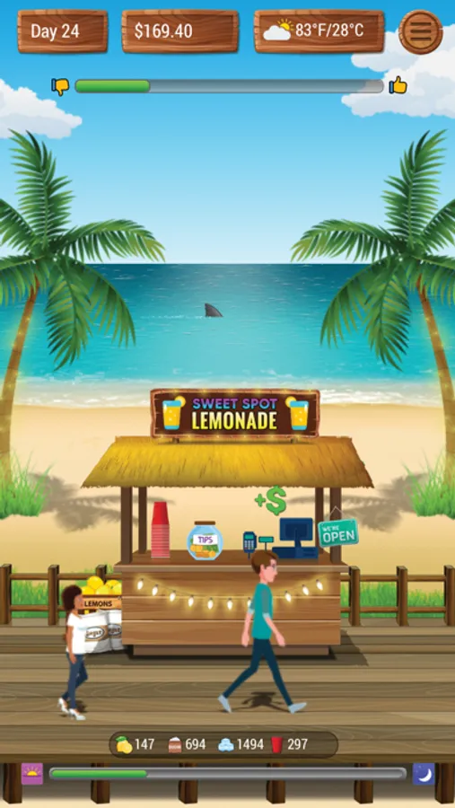 Welcome to summer in Citrus Bay! You have the opportunity to build a successful Lemonade Stand right on the boardwalk, but it won't be easy. You have to manage your inventory, determine demands, perfect your recipe, set competitive pricing, advertise, upgrade, and more! This isn't your run-of-the-mill business sim though. Citrus Bay always has something going on and you'll have to deal with unpredictable weather and frequent local news events that will require strategy to maximize your growth and popularity. Additionally, you will have a diverse customer base of all ages, price limits, and taste preferences that will reward your good decisions and call out the bad ones. Grow your stand and upgrade to earn benefits and boosts that will help you along the way to survive 90 days of summer.