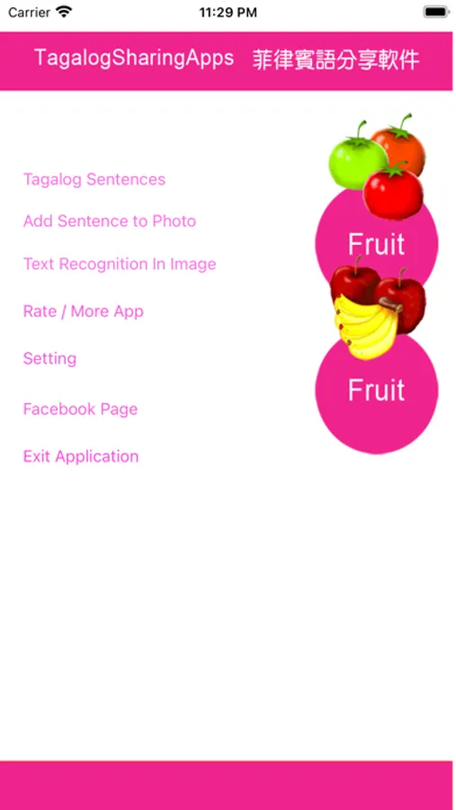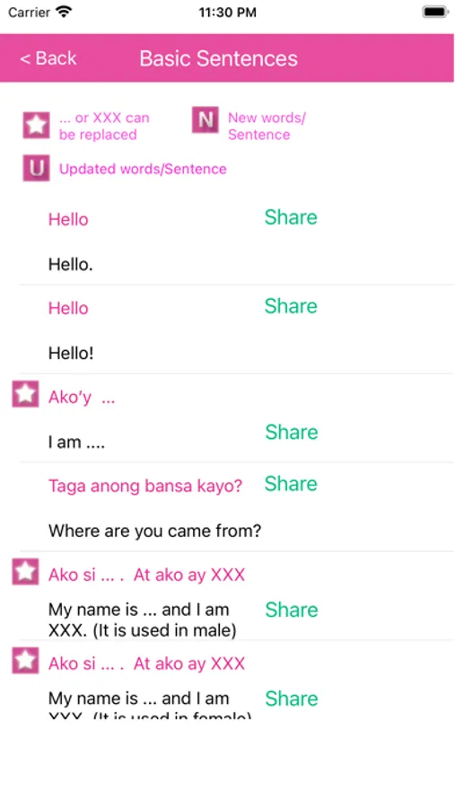 There are three categories which allow user to send messages in Tagalog such as basic sentences, greeting and love.