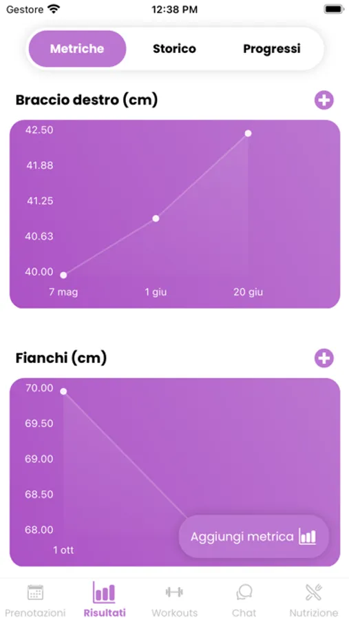 • Monitorare i tuoi progressi registrando o aggiungendo le tue metriche (peso, massimali, ecc…).