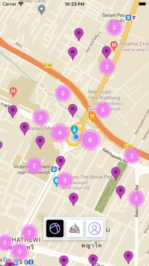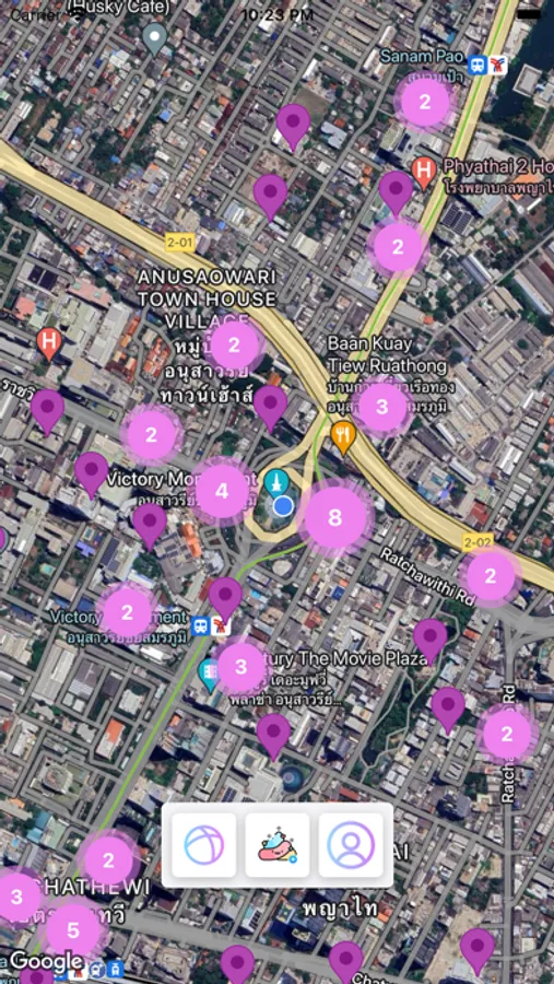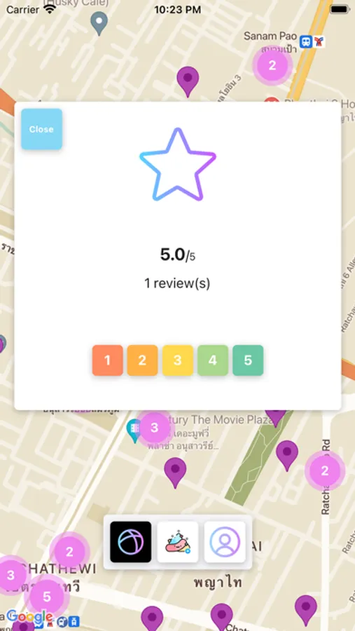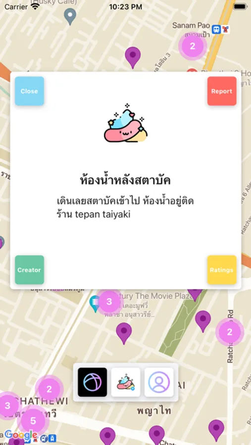 To pin a toilet, click the poop icon, then tap on a map at the location where the toilet is. You can click the profile icon to edit your profile and click the earth icon to switch the map style.