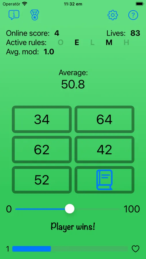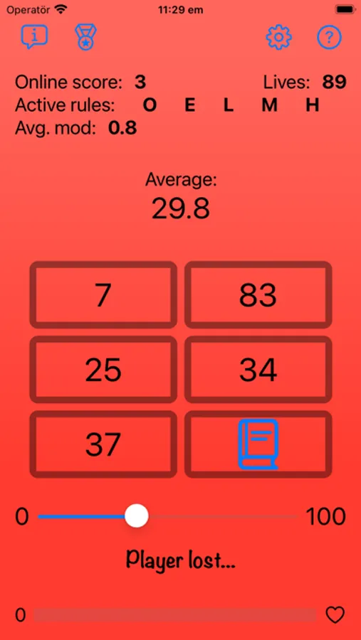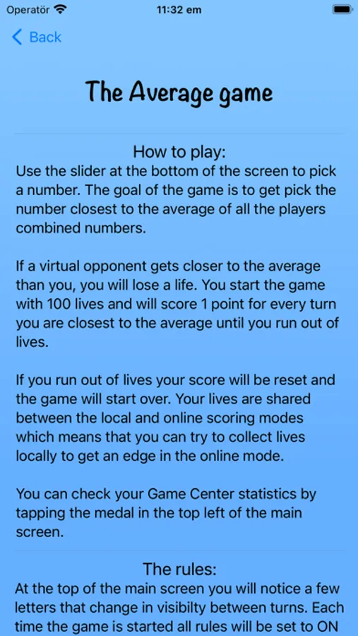 The goal of the game is to pick a number as close to the average of the sum of all the players picked numbers as possible. If you get closest to the average you will earn a point. If you are not the closest you will lose a life. You get 100 lives at the start of the game. When all 100 lives are gone the score will be reset and you have to start over.