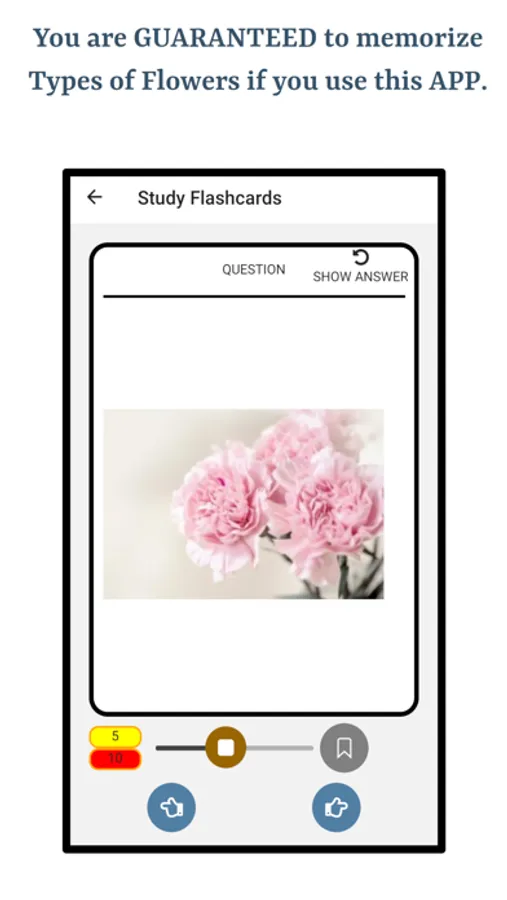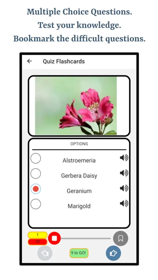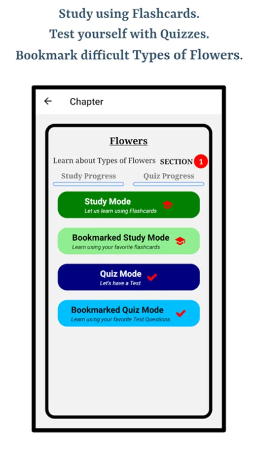 This app is a great resource to memorize Types of Flowers . The app is engineered to make users perfect identifying types of flowers by studying for a very short amount of time. Audio functionality and bookmarking is available throughout the app on chapter, section, study mode and quiz modes.