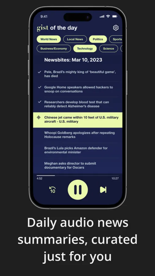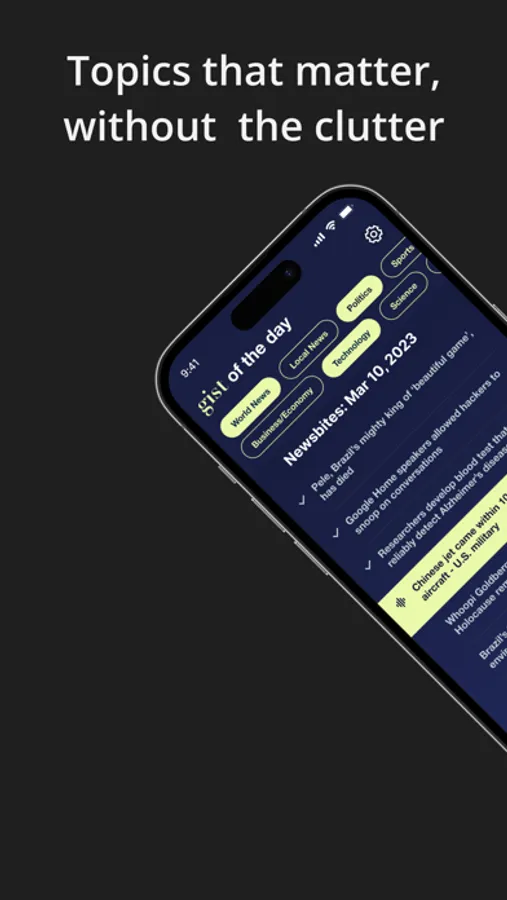 Stay on top of the news with gist, your personalized audio news summary app. We bring the world to your ears in just a few minutes, tailored to your interests and delivered when you want it.