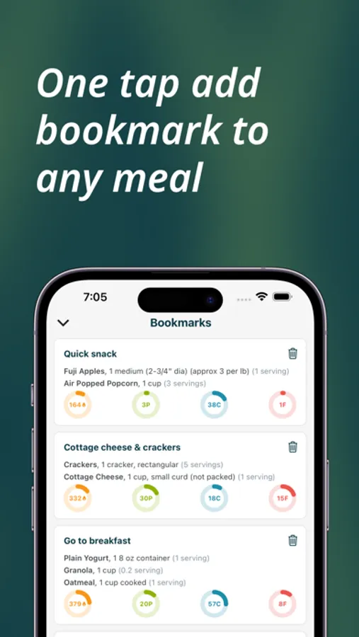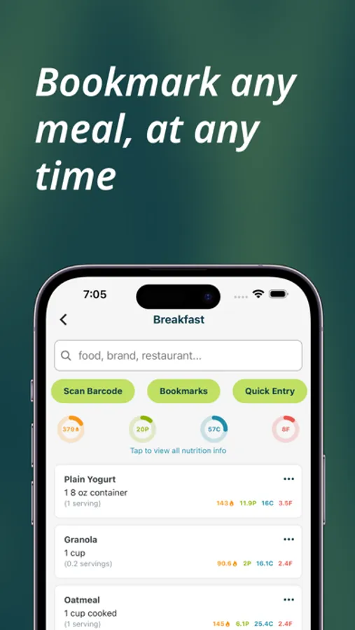 This is not your normal food logging experience. We believe logging food should be super quick and easy so you can go about your day. We have made this a reality by making it simple to bookmark any meal at any moment. It's super quick and easy to take a snapshot of any meal for super fast quick adds at a later time. In addition, if you are that person that eats the same frequent meals, we won't even make you tap to bookmark. Your prior day's meals are right in front of your face for a one tap log entry. This app was designed by users who have been logging food for years and just wanted more out of their food logging experience. Macros and calories are up front and personal in every screen while logging your food.