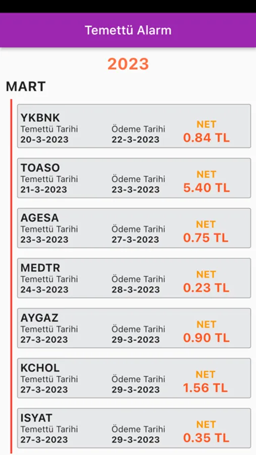 Bist Hisselerinin temettü bilgilerini gösterir. Ödenecek Net Temettü miktarını, Temettü Gününü ve Temettü Ödeme Gününü listeler. Ayrıca Temettü günü gelen hisseler için bildirimle seans öncesinde sizi uyarır.