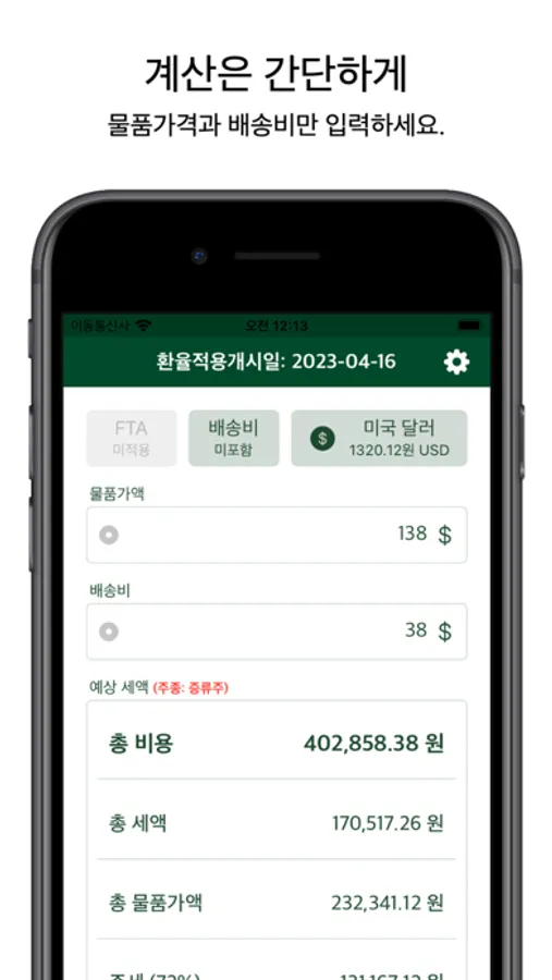 - 항목 별 안내 기능 (총 비용, 총 세액, 물품가액, 주세, 교육세, 관세, 부가세)