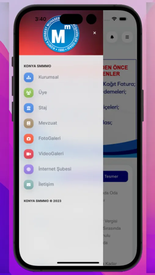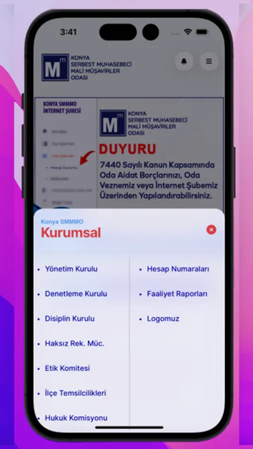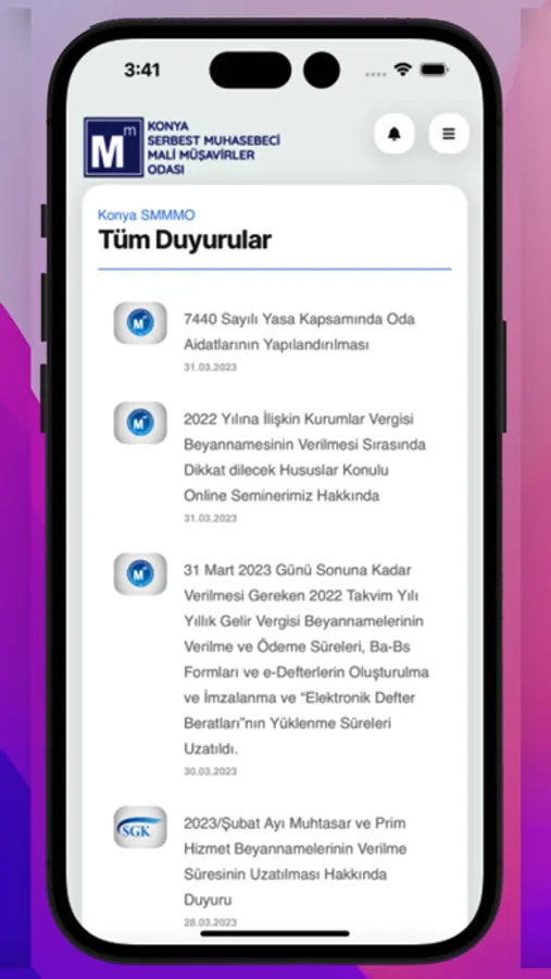 Konya SMMM Odası Mobil uygulamasıyla KONYA SMMMO hakkında ve mesleki tüm duyurulara, haberlere, yayınlara, medya içeriğine ve web sitemizde yer alan tüm bilgilere kolaylıkla kısa yoldan erişebilirsiniz. Mesleki ve Odamızla ilgili gelişmeler bildirim olarak gönderilmektedir. Yazılım: Ali İzmirli
