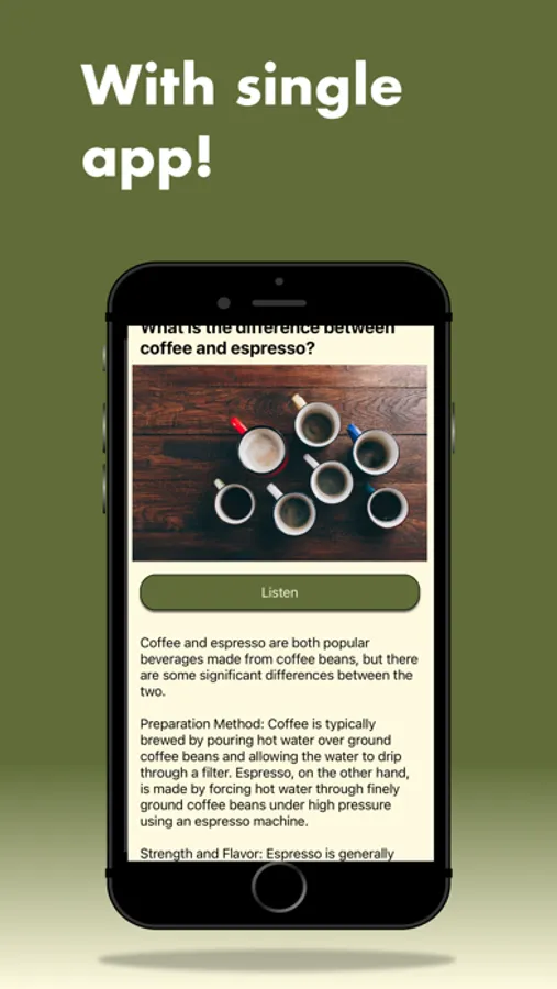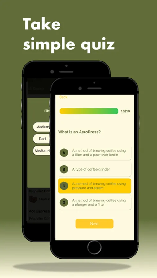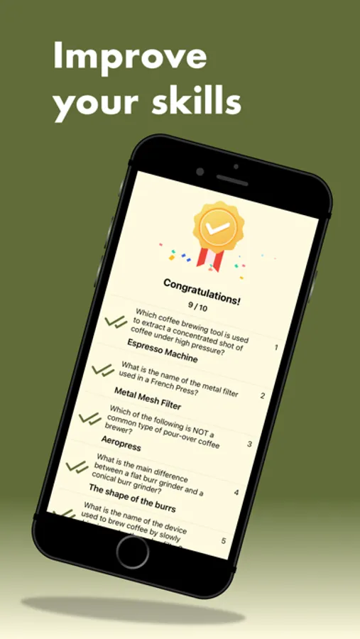 But that's not all. Our app also features an engaging quiz game that will test your coffee knowledge and challenge you to think outside the box. With questions covering everything from bean varieties to brewing methods, you'll never run out of ways to expand your coffee horizons.