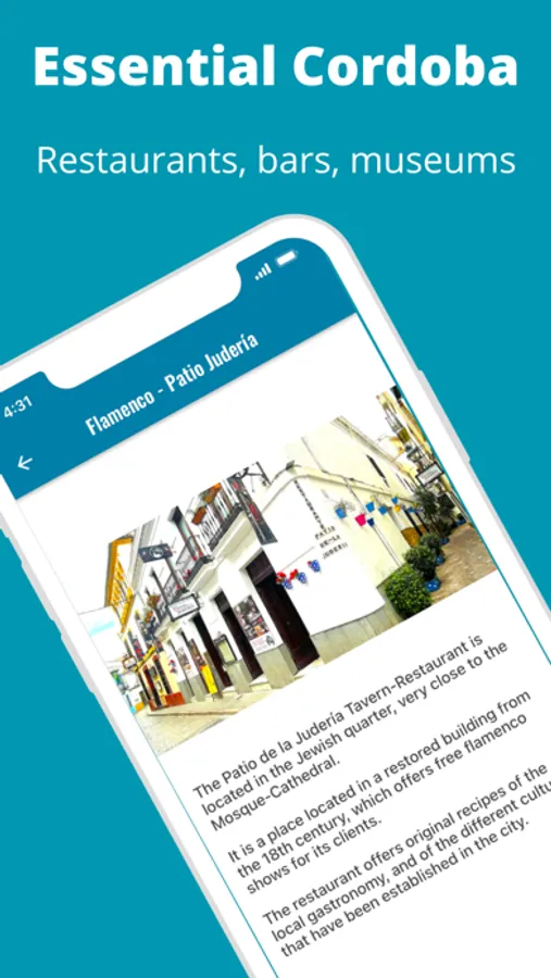 This tour covers the historic center of the city of Córdoba, from the famous Plaza del Potro to the Alcazar de los Reyes Católicos, passing through emblematic sites such as the Cathedral Mosque and other very characteristic ones such as the alley of flowers or the synagogue. Among the recommended places are bars and typical places in which to enjoy the gastronomy and local atmosphere, and important museums.