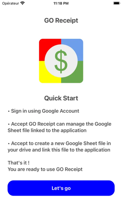 • A Google Sheet file linked to the application. GO Receipt could create it for you !