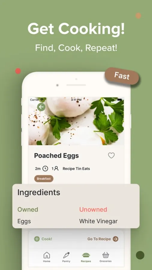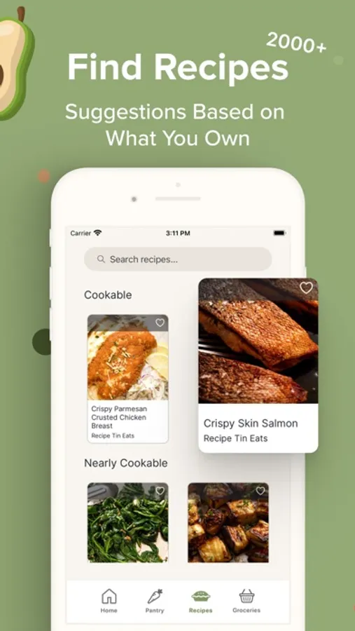 To find recipes, you first input the ingredients that you have in your kitchen. We've implemented multiple techniques to streamline this process, such as ingredient suggestions, prompts for items that you ran out of, and the ability to transfer items with just one tap from your shopping list to your pantry. The process of managing your Pantry will also consistently be improved going forward.