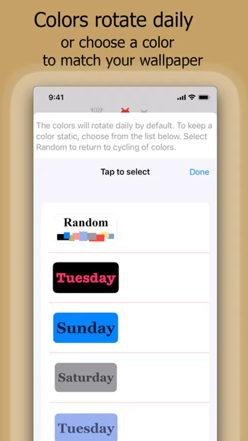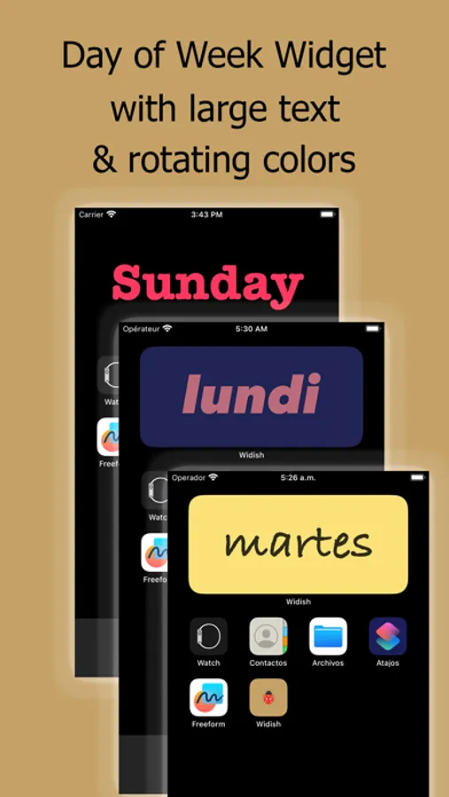 Customize your phone with this simple day of week widget, in your preferred language. Choose from over 50 fonts. The colors will rotate daily, or you can choose a color scheme to remain stationary. One time purchase with no ads, no subscriptions. Widgets!!