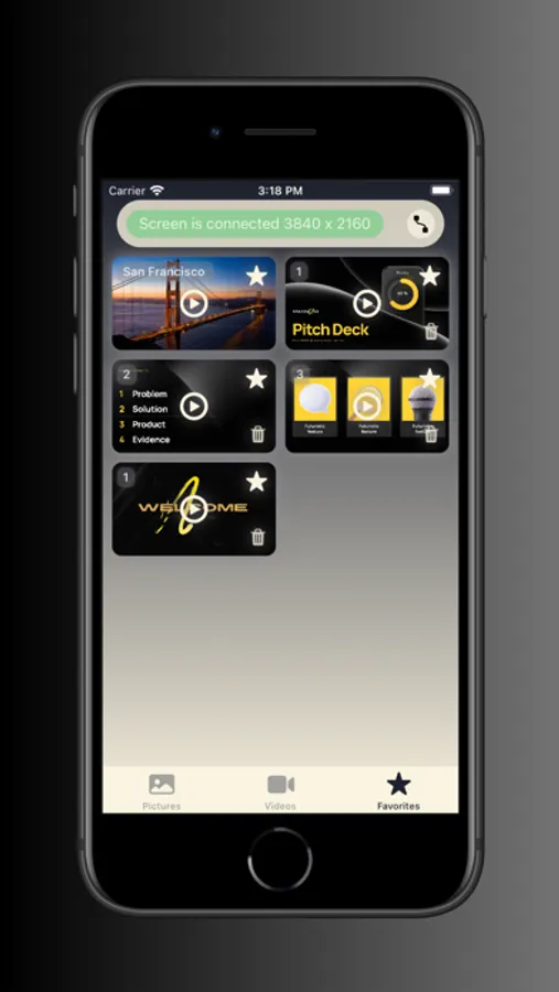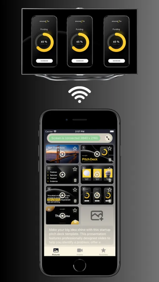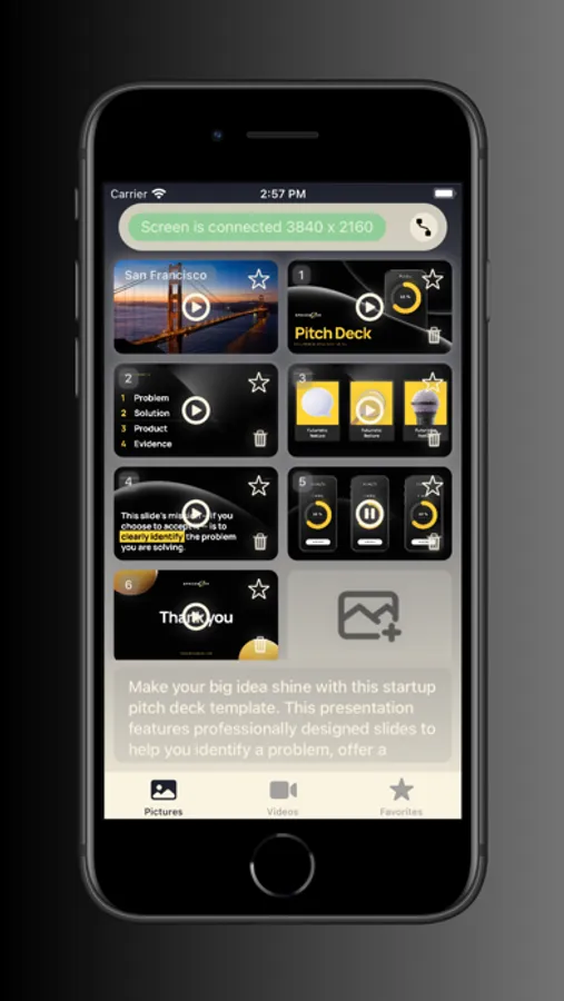 This application allows you to easily connect your device to an external screen, such as a TV, monitor, or projector, and display videos or photos. With just a few taps, you can wirelessly connect to the external screen using Wi-Fi and AirPlay or connect your device by appropriate cable or adapter. Once connected, you can browse through your device's media library and select the videos or photos you want to display on the external screen. You can also add text to each photo or video and view it on your phone screen when playing it on an external screen, this can make the app really convenient for those who will use it to broadcast the presentation.